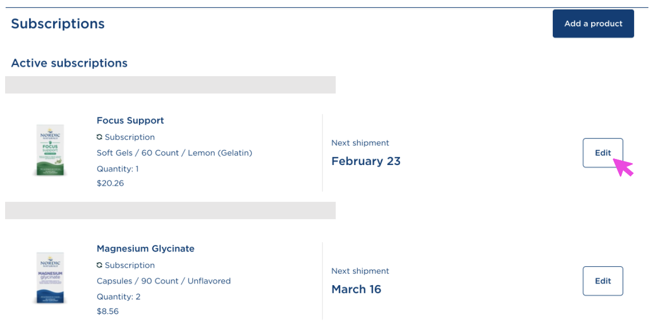 - Find the Active Subscription for the product you would like to swap and click the Edit button.